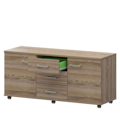 КРАТКОЕ ОПИСАНИЕ: Исполнение:дуб сафари,лиственница, сосна винтер. Тиснение: Шпон . Металлокаркас (М)-профиль 60*30. Цвет: металлик , белый,антрацит. Соединение со столешницей- "металл-металл". Столешницы,опоры столов, приставка, топы и основания шкафов изготовлены из ЛДСП толщиной 25мм, облицованы противоударной кромкой ПВХ 2 мм производства фирмы Rehau (Германия) в цвет изделия. Каркасы стеллажей и тумб, фасады изготовлены из ЛДСП толщиной 16мм. Ящики тумб- ЛДСП 16мм , цвет: лайм. Стекло тонированное в массе 4мм-графит. В шкафах использованы декоративные регулируемые опоры H-50мм цвета матовый хром.Столешницы соеденены с опорами проставками цвета матовый хром.