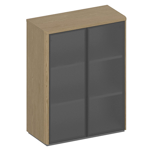 Стеклянные дверцы высокого и среднего уровня в рамке из алюминиевого профиля черного цвета с интегрированной алюминиевой ручкой на вертикальной планке, стекло «серый сатин».