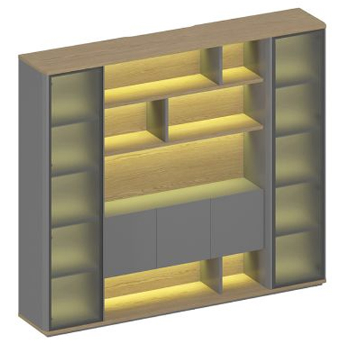в открытой секции шкафа комбинированного с подсветкой: для дверей толщиной 16 мм и декоративных боковых стенок толщиной 30 мм используется плита МДФ, окрашенная со всех сторон матовой эмалью цвета антрацит;