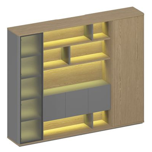 в открытой секции шкафа комбинированного с подсветкой: для дверей толщиной 16 мм и декоративных боковых стенок толщиной 30 мм используется плита МДФ, окрашенная со всех сторон матовой эмалью цвета антрацит;