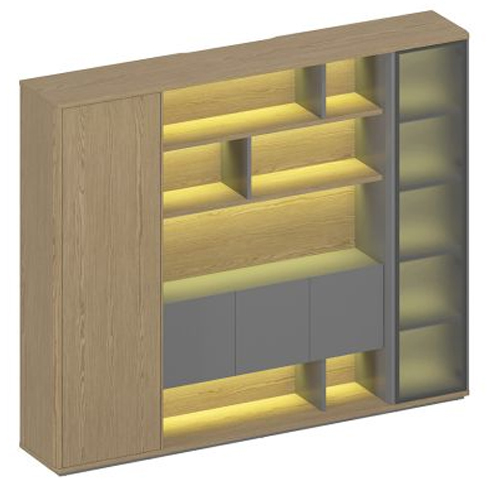 Светодиодная подсветка полок в открытой секции и за стеклянной двери узкой секции шкафа, включение подсветки сенсорное, осуществляется касанием руки.