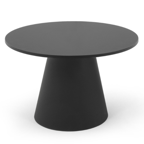 Круглая столешница — в шпоне, меламине или HPL — опирается на лаконичную металлическую конусообразную опору.
