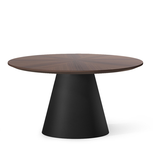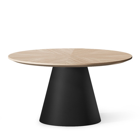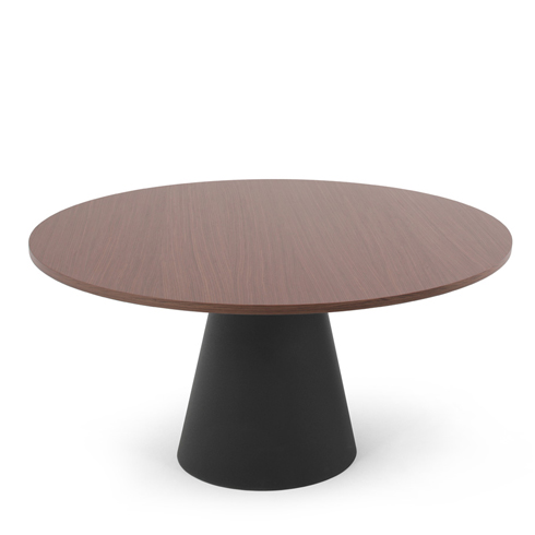 Круглая столешница — в шпоне, меламине или HPL — опирается на лаконичную металлическую конусообразную опору.