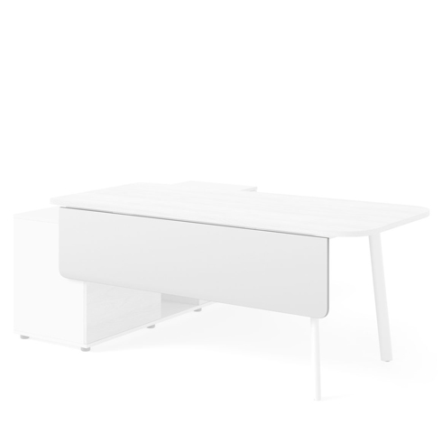 Опорная тумба может быть установлена как справа, так и слева, при этом столешница трапециевидной формы всегда крепится к опорной тумбе короткой стороной.