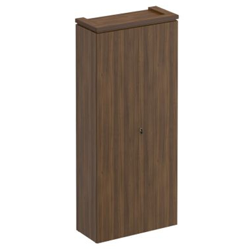 Все фасадные элементы изделий обложены массивом твердолиственных пород древесины толщиной 10 мм, придающим кабинету более дорогой статусный внешний вид. Выверенную геометрию подчеркивают ручки, выполненные из массива твердолиственных пород древесины, используемые на всех видах шкафов и тумб кабинета. Стеклянные двери также исполнены в рамке из МДФ, облицованного шпоном твердолиственных пород древесины, а с торцевой стороны рамки предусмотрена ручка, расположенная вдоль всей ширины дверцы, выполненная из массива твердолиственных пород древесины.