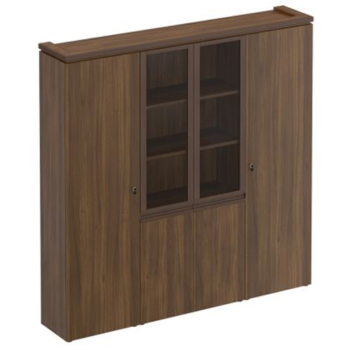 Все фасадные элементы изделий обложены массивом твердолиственных пород древесины толщиной 10 мм, придающим кабинету более дорогой статусный внешний вид. Выверенную геометрию подчеркивают ручки, выполненные из массива твердолиственных пород древесины, используемые на всех видах шкафов и тумб кабинета. Стеклянные двери также исполнены в рамке из МДФ, облицованного шпоном твердолиственных пород древесины, а с торцевой стороны рамки предусмотрена ручка, расположенная вдоль всей ширины дверцы, выполненная из массива твердолиственных пород древесины.