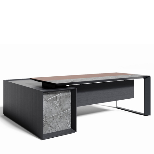 Столы руководителя: Столешница толщиной 50 мм, с обратным скосом под углом 30 градусов, с покрытием rock board* + фиксированная кожаная накладка, опоры из стали с порошковым покрытием.
