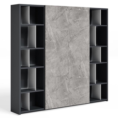 Шкафы: Фасады шкафов изготовлены с отделкой "каменный шпон" (rock board). В шкафу-гардеробе, в центральной нише выполнена ниша с вешалками под одежду средней длины. По краям шкафа размещена светодиодная подсветка c t свечения 4000K, которая включается при движении дверей в центр композиции.