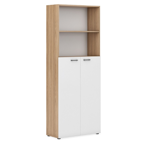 У шкафов, - корпус и полки Дуб Честерфилд; фасады и задняя стенка Белые, ручки антрацит.